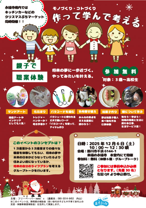 開催は2025年12月6日に初回開催。掛川市内や近隣の未就学児~中高生及び保護者を対象。3歳から16歳の子供30名が親と参加。参加料無料。